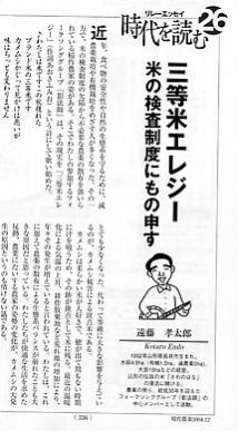 原稿の執筆依頼が来たのが稲刈りの真っ最中で「今年はカメムシの発生はどうなんでしょうね」などとやり取りをしながら引き受けた。掲載されたのは現代農業という月刊誌の12月号、タイトルは「米の検査制度に物申す三等米エレジー」。米の検査制度、特に斑点米の検査規格が農家の収穫直前のカメムシ退治の殺虫剤の大量散布に繋がっていること。斑点米によって食味が落ちたりしないこと、斑点米の検査基準を少し緩めるだけで農薬の使用量が大幅に減らせることを歌詞を埋め込みながら現した。掲載後、記事を見た数人から激励をいただき喜んでいた。